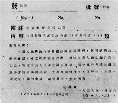 1949年1月20日,中华人民共和国成立前夕,毛泽东致电陈嘉庚,邀请他回国参加新政治协商会议。2月8日,陈嘉庚复电毛泽东,表示“革命大功将告完成,曷胜兴奋!严寒后决回国敬贺。蒙电邀参加新政治协商会议,敢不如命。惟庚于政治为门外汉,国语又不通,冒名尸位,殊非素志,千祈原谅!”